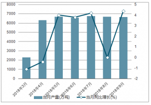 2018年2-9月中國生鐵各月當月產(chǎn)量及同比增長走勢