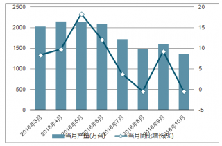 2018年2-10月中國房間空氣調(diào)節(jié)器各月當(dāng)月產(chǎn)量及同比增長走勢(shì)