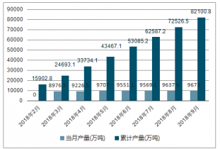 2018年2-9月中國鋼材各月當(dāng)月產(chǎn)量及累計(jì)產(chǎn)量走勢