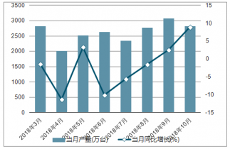 2018年10月中國(guó)微型計(jì)算機(jī)設(shè)備產(chǎn)量達(dá)到2824.3萬(wàn)臺(tái),同比下滑9%;2018年1-10月累計(jì)產(chǎn)量達(dá)到24853.5萬(wàn)臺(tái),累計(jì)增長(zhǎng)-1.8%。