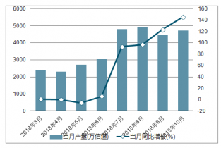2018年10月中國(guó)移動(dòng)通信基站設(shè)備產(chǎn)量達(dá)到4726.8萬(wàn)信道,同比增長(zhǎng)145.8%。2018年1-10月中國(guó)移動(dòng)通信基站設(shè)備產(chǎn)量為33032.2信道,累計(jì)增長(zhǎng)41.8%。