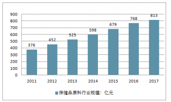 2016年中國(guó)保健品原料制造行業(yè)市場(chǎng)規(guī)模約813億元,同比2016年的768億元增長(zhǎng)了58.59%。