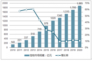 2010-20120年中國寵物行業(yè)市場規(guī)模及增長率走勢