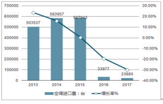 2013-2017年中國空調(diào)進(jìn)口量及增長率走勢(臺,%)
