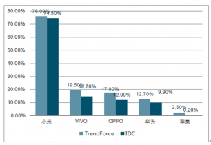IDC、TrendForce五大智能手機(jī)品牌全球出貨量增速對(duì)比(單位:%)