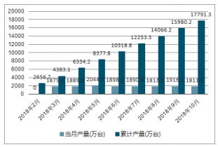 2018年3-10月中國電工儀器儀表各月當(dāng)月產(chǎn)量及累計產(chǎn)量走勢
