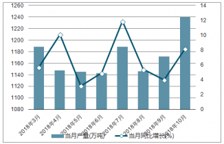 2018年2-10月中國(guó)汽油各月當(dāng)月產(chǎn)量及同比增長(zhǎng)走勢(shì)