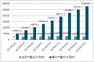 2018年3-10月中國(guó)發(fā)電各月當(dāng)月產(chǎn)量及累計(jì)產(chǎn)量走勢(shì)
