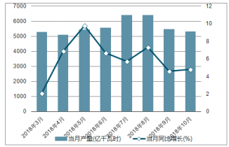 2018年2-10月中國發(fā)電各月當月產(chǎn)量及同比增長走勢