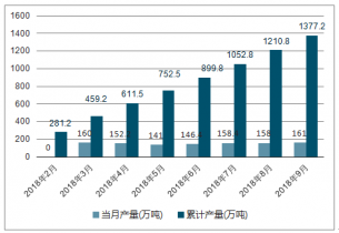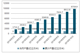 2018年3-10月中國煤氣各月當(dāng)月產(chǎn)量及累計(jì)產(chǎn)量走勢