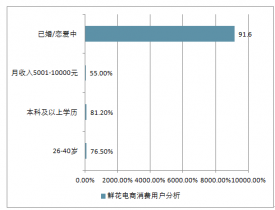 鮮花電商用戶(hù)主要集中在26-40歲,其中26-30歲之間占比34.9%,成為消費(fèi)興起的主力軍。具有本科及以上學(xué)歷的用戶(hù)占81.2%,個(gè)人月收入主要集中在5001-10000元,91.6%為已婚/戀愛(ài)中人士。
