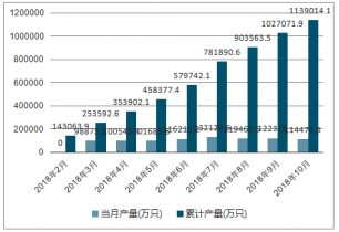 2018年2-10月中國鋰離子電池各月當(dāng)月產(chǎn)量及累計(jì)產(chǎn)量走勢