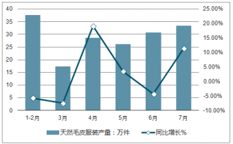 2018年1-7月全國天然毛皮服裝產(chǎn)量及同比增長走勢(shì)