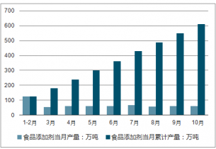 2018年1-10月全國(guó)食品添加劑當(dāng)月產(chǎn)量及當(dāng)月累計(jì)產(chǎn)量走勢(shì)
