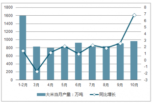 2018年10月全國大米產(chǎn)量為963.52萬噸,同比增長6.88%。2018年1-10月全國大米產(chǎn)量為8526.11萬噸,同比增長3%。