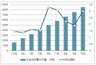 2018年1-10月全國大米當(dāng)月累計(jì)產(chǎn)量及增長走勢(shì)