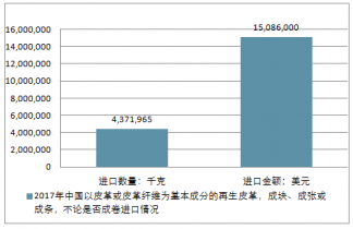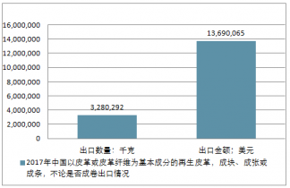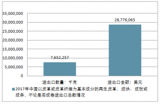 2017年中國以皮革或皮革纖維為基本成分的再生皮革,成塊、成張或成條,不論是否成卷進(jìn)出口總量7,652,257千克,進(jìn)出口總金額28,776,065美元。