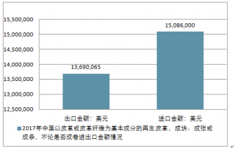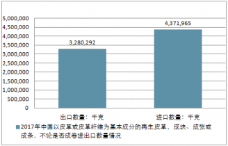 2017年中國以皮革或皮革纖維為基本成分的再生皮革,成塊、成張或成條,不論是否成卷進出口總量7,652,257千克,進出口總金額28,776,065美元。