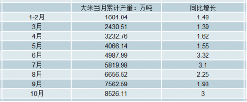 2018年1-10月全國大米當(dāng)月累計產(chǎn)量及增長走勢