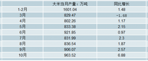 2018年10月全國大米產(chǎn)量為963.52萬噸,同比增長6.88%。2018年1-10月全國大米產(chǎn)量為8526.11萬噸,同比增長3%。