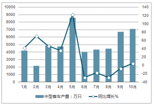2018年10月中型客車產(chǎn)量為7105輛,同比增長(zhǎng)4.56%。2018年1-10月中型客車產(chǎn)量為51331輛,同比增長(zhǎng)11.29%。