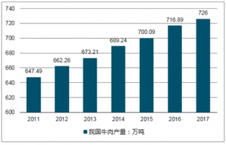 2017全年我國豬牛羊禽肉產(chǎn)量8431萬噸,比上年增長0.8%,2019年我國牛肉產(chǎn)量達(dá)到726萬噸。