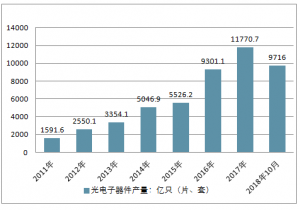2017年中國光電子器件產(chǎn)量為11770.7億只(片、套),2018年1-10月我國光電子器件產(chǎn)量為9716.0億只(片、套),產(chǎn)量較2017年同期增長0.7%。