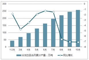 2018年10月全國(guó)冷凍飲品產(chǎn)量為12.34萬(wàn)噸,同比下降1.14%。2018年1-10月全國(guó)冷凍飲品產(chǎn)量為257.97萬(wàn)噸,同比下降7.1%。