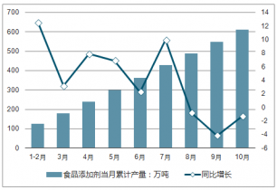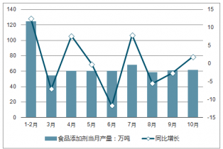 2018年1-10月全國食品添加劑當月產量及增長走勢