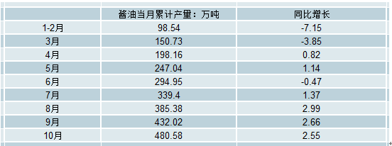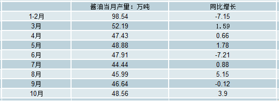 2018年10月全國醬油產量為48.56萬噸,同比增長3.9%。2018年1-10月全國醬油產量為480.58萬噸,同比增長2.55%。