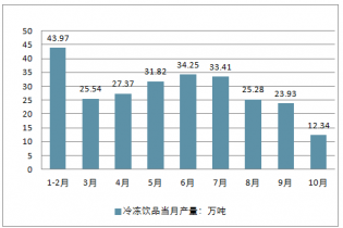 2018年10月全國(guó)冷凍飲品產(chǎn)量為12.34萬(wàn)噸,同比下降1.14%。2018年1-10月全國(guó)冷凍飲品產(chǎn)量為257.97萬(wàn)噸,同比下降7.1%。