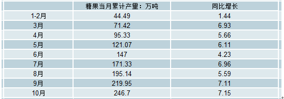 2018年10月全國糖果產(chǎn)量為26.76萬噸,同比增長3.6%。2018年1-10月全國糖果產(chǎn)量為246.7萬噸,同比增長7.15%。