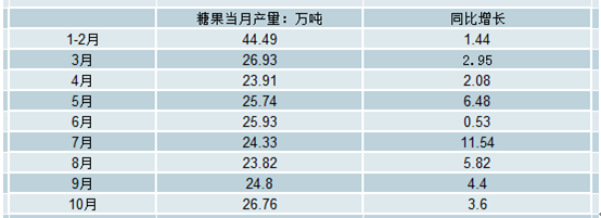 2018年1-10月全國糖果當(dāng)月累計(jì)產(chǎn)量及增長走勢