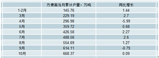 2018年1-10月全國方便面當(dāng)月累計產(chǎn)量及增長走勢