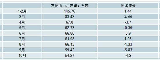2018年10月全國方便面產(chǎn)量為54.27萬噸,同比下降4.2%。2018年1-10月全國方便面產(chǎn)量為668.37萬噸,同比增長0.09%。