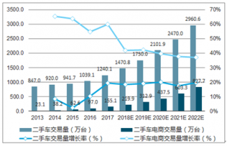 2013-2022年中國二手車行業(yè)及電商行業(yè)交易量