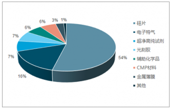 從我國IC用電子化學(xué)品產(chǎn)品結(jié)構(gòu)來看,硅片占總消費(fèi)的54%、電子特氣占16%、超純試劑7%、光刻膠7%、輔助化學(xué)品6%、CMP材料6%。