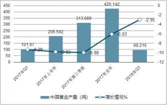 2017-2018年Q1中國黃金產(chǎn)量及增長(zhǎng)情況