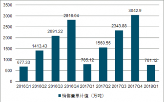 2016-2018Q1年中國燒堿銷量統(tǒng)計(jì)圖
