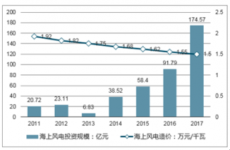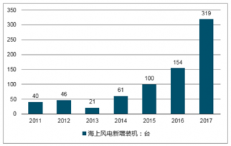 2017年中國海上風(fēng)電取得突破進展,新增裝機共319臺,新增裝機容量達到116萬千瓦,同比增長97%;累計裝機達到279萬千瓦。