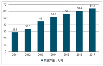 我國茶油總產(chǎn)量不高,精煉茶油的產(chǎn)量更是有限。近幾年,茶油產(chǎn)量呈現(xiàn)與植物油產(chǎn)量同步增長的趨勢,同時也因油茶樹的大小年交替呈現(xiàn)一定的波動性。2016年我國茶油產(chǎn)量為60.4萬噸,2017年國內(nèi)茶油產(chǎn)量增長至64.3萬噸,產(chǎn)量同比增長6.46%。