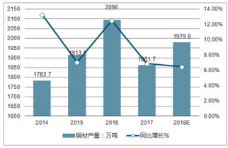 2014-2018年中國(guó)銅材產(chǎn)量及同比增長(zhǎng)走勢(shì)