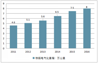 2011-2016年中國鐵路電氣化里程(單位:萬公里)