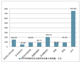 2016年我國(guó)物流倉(cāng)儲(chǔ)系統(tǒng)設(shè)備分類規(guī)模(單位:億元,%)