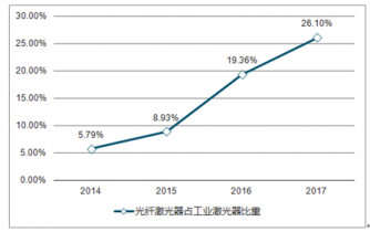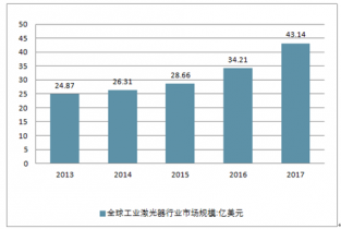 2013-2017 年,全球激光器行業收入規模持續增長,從 2013 年的 89.70 億美元增加至 2017 年的 124.30 億美元,年復合增長率為 8.50%。隨著大功率激光器技術突破和增材制造技術的成熟,預計未來激光器行業將持續快速增長。 其中, 全球工業激光器收入從 2013 年的 24.87 億美元增加至 2017 年的 43.14 億美元,年復合增長率為 14.76%。 2015-17 年,工業激光器市場規模增速分別為 8.93%、 19.36%和 26.10%,呈現加速發展的趨勢。