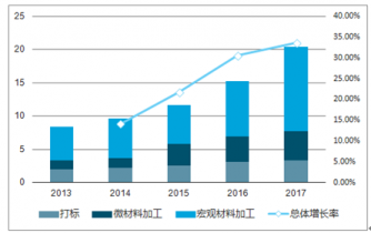近年來工業激光器的市場規模呈現快速增長態勢,從2013年的24.87億美元增長至2018年的43.14億美元,復合增長率為14.76%。 其中,光纖激光器的增速更快,用于宏觀材料加工、微材料加工和打標的光纖激光器的市場規模均快速成長,整個光纖激光器的市場規模也從2013年的8.41億美元增加至2018年的20.39億美元,復合增速達24.78%,同時光纖激光器在工業激光器中的市場占比也從2013年的33.82%提升至47.26%,也成為了市場份額最大的工業激光器