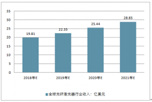 全球光纖激光器 2020 年市場(chǎng)規(guī)模近 200 億元。 根據(jù)預(yù)測(cè),全球光纖激光器的銷售額將由 2018 年的 19.81 億美元增加到 2021 年的 28.85 億美元,年復(fù)合增長(zhǎng)率為 13.35%。