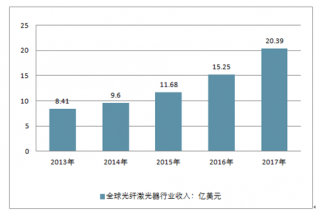 全球光纖激光器 2013-2017 年 CAGR 達(dá) 24.78%,行業(yè)高速成長(zhǎng)。全球光纖激光器收入從 2013年的 8.41 億美元,增加至 2017 年的 20.39 億美元,年復(fù)合增長(zhǎng)率為 24.78%,
