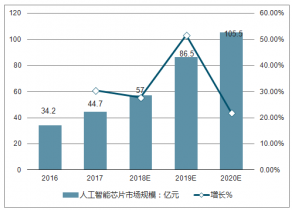 2016-2020年全球人工智能芯片市場規(guī)模及增長率走勢