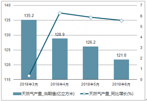 2018年上半年各月當(dāng)月我國(guó)天然氣產(chǎn)量及同比增長(zhǎng)情況